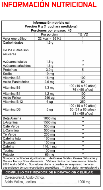 - Energía Explosiva: Gracias a su mezcla de Beta Alanina, L-Arginina, Taurina, Guaraná y un alto contenido de cafeína, te permitirá entrenar más fuerte y por más tiempo.